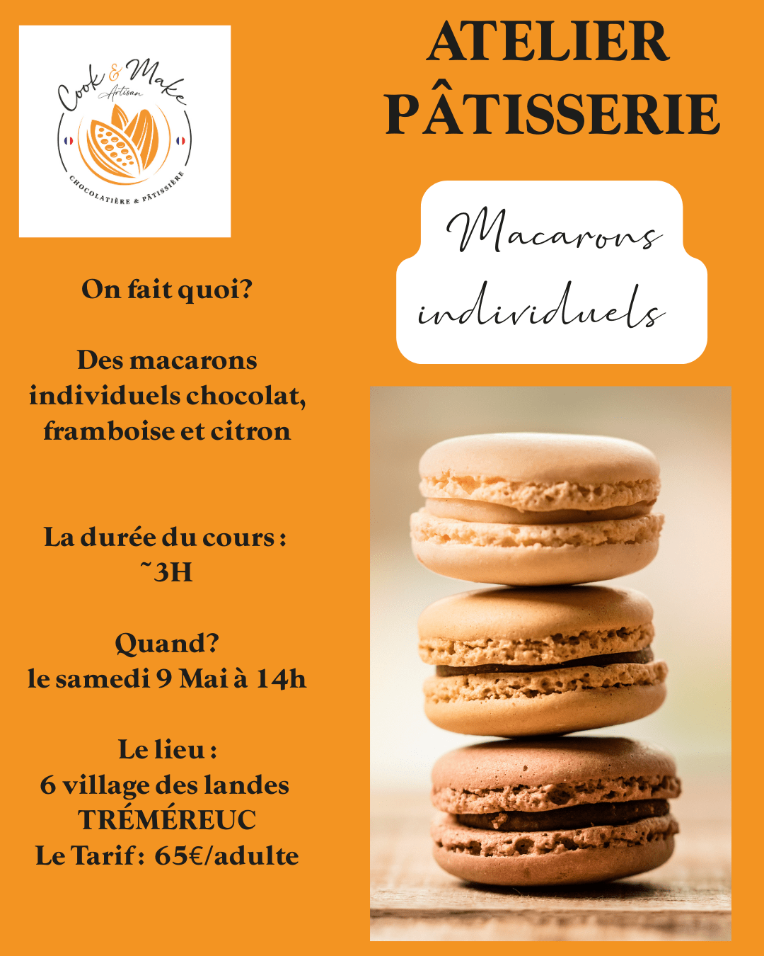 Ce cours est l’occasion idéale de découvrir les secrets de la réussite des macarons, d’échanger autour de la pâtisserie et de repartir avec votre propre création, à déguster en famille ou entre amis.